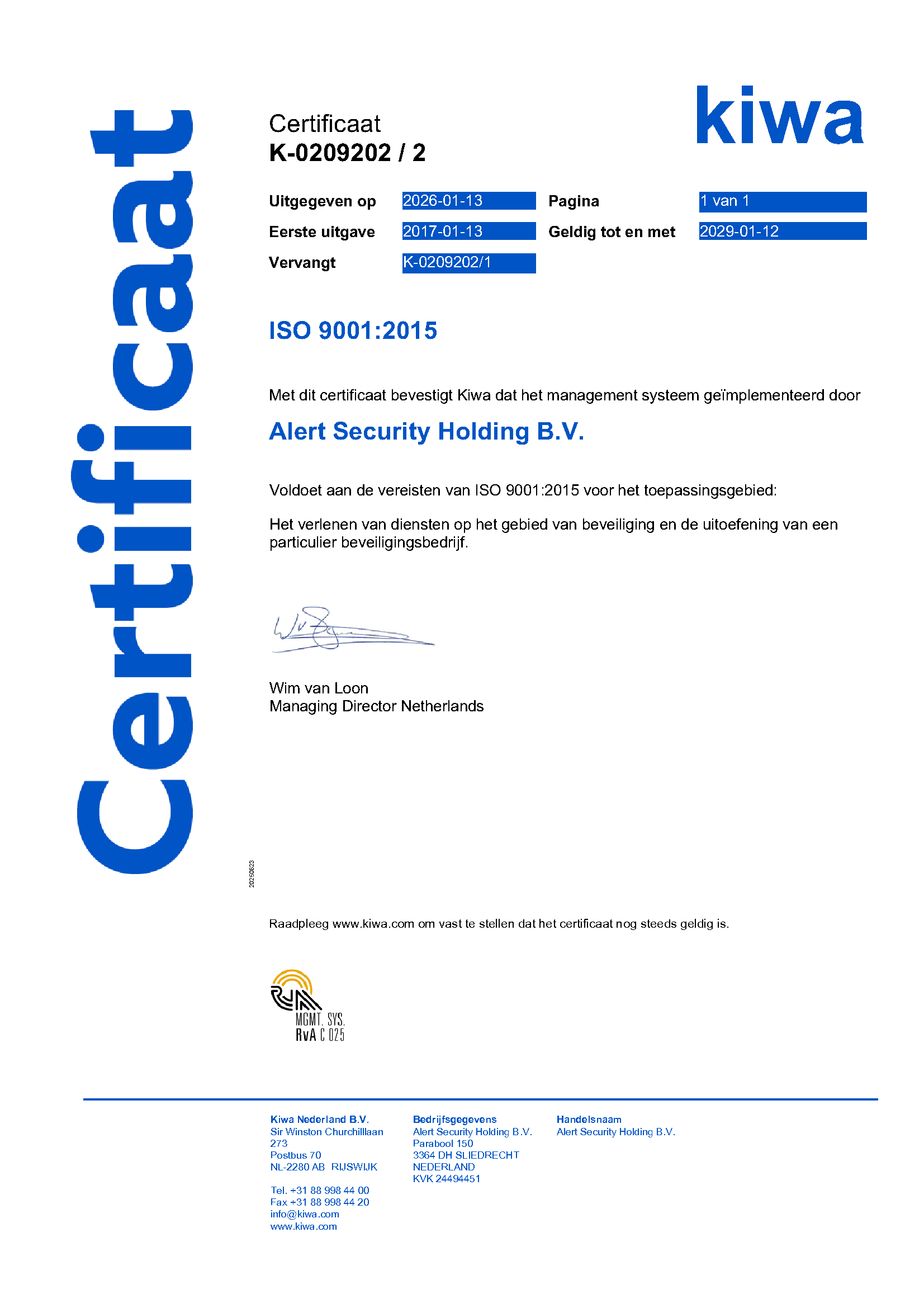 Het NEN-EN-ISO 9001:2015 certificaat geeft aan dat onze organisatie voldoet aan de wereldwijd erkende norm op het gebied van kwaliteitsmanagement. Mede door dit certificaat tonen wij bij klanten en prospects aan dat onze processen voldoen en wij veel waarde hechten aan continue verbetering van kwaliteit, Kwaliteits-management komt terug in alle onderdelen binnen onze organisatie zodat de door ons geleverde diensten voldoen aan de behoeften, eisen, wensen en specificaties van klanten, maar ook andere belang-hebbenden. Het kwaliteitsmanagementsysteem is van toepassing op het verlenen van diensten op het gebied van beveiliging en veiligheid.